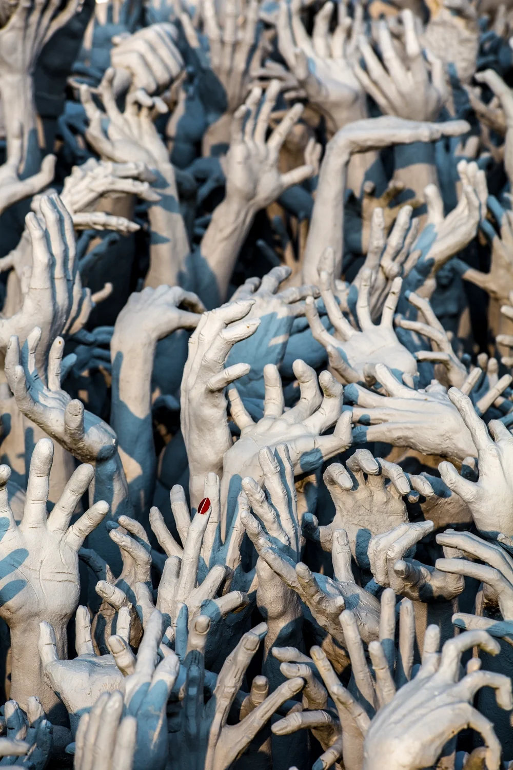 Wat Rong Khun is one of the most beautiful structures I’ve ever seen in my life. Even after feeling like I’d seen every kind of wat possible in Chiang Mai, this magnificent building too my breath away. From a distance, the white walls and silver mirrors glitter dazzlingly in the sun. A bridge over the reflecting pond in front of the wat, stocked with white koi, leads to a depiction of hell as imagined by the artist. White hands reach with yearning toward goals they will never achieve, as a ring of demons stands guard: a warning about the danger of unmitigated desire. You pass over this hell, and continue to the “Gate of Heaven” where you are greeted by a statues representing death and Rahu, a being who judges the dead. Finally, you enter the main structure, the Ubosot, where you are, unfortunately, unable to take pictures.